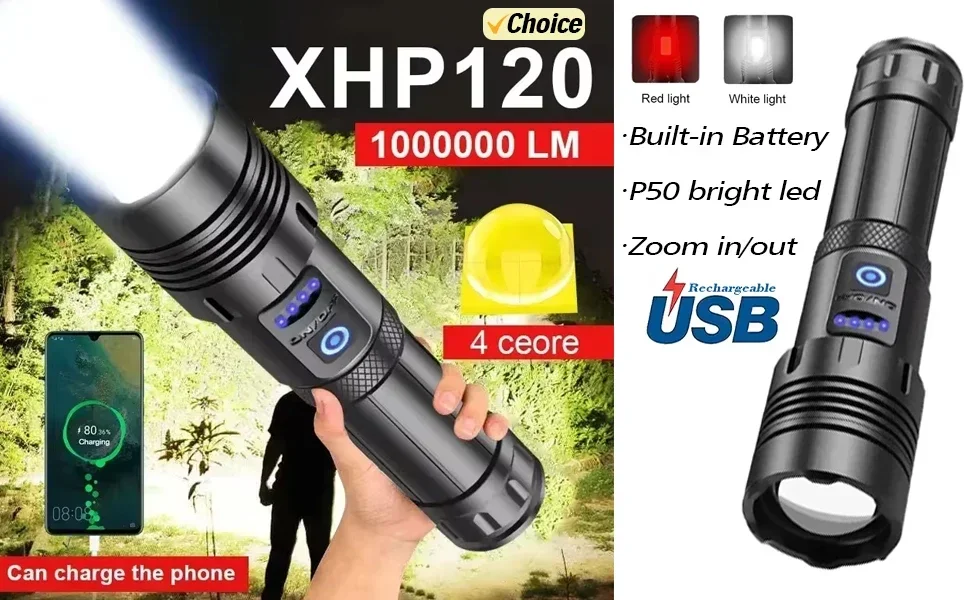 High Power Rechargeable Flashlight Built-in Battery Strong Lamp Tactical Torch Light Outdoor Camping Hiking Flashlights